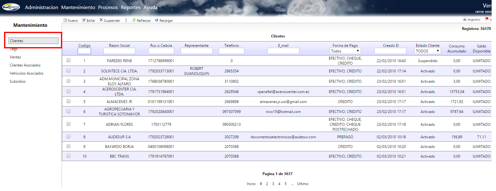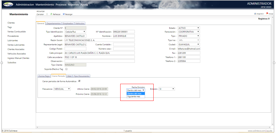 - Cambiar la opción de tipo de facturación “dentro del mismo mes” en FuelControl de clientes crédito/prepago, para la facturación de mayo 2016. Se debe tomar en cuenta que a partir del 1 de junio del 2016 se aplica el nuevo IVA del 14% para las ventas de combustibles, motivo por el cual las transacciones que se realizaron dentro del mes de mayo con IVA 12%, deben ser facturadas dentro del mismo mes. Aplica solo para clientes que tienen configurado el tipo de facturación “próximo mes” de facturación mensual o quincenal.